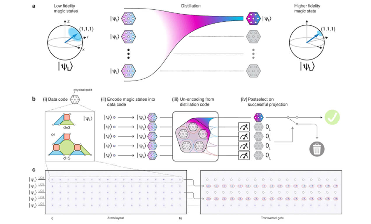 In collaboration with Harvard and MIT, QuEra demonstrated logical‑level magic‑state distillation entirely within the logical qubit layer on Gemini, building error‑protected logical qubits using distance‑3 and distance‑5 color codes and a 5‑to‑1 distillation protocol.